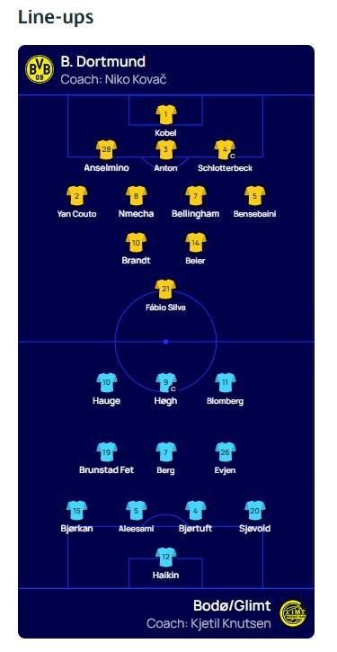 北京时间12月11日04:00,欧冠 联赛阶段 第6轮,多特蒙德主场迎战博德闪耀,赛前双方球队首发名单公布如下: